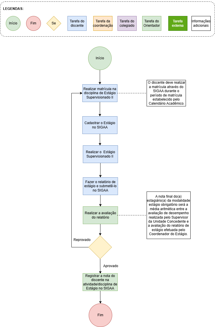 1. O discente deve realizar a matrícula na disciplina Estágio Supervisionado II através do SIGAA durante o período de matrícula estabelecido pelo Calendário Acadêmico.