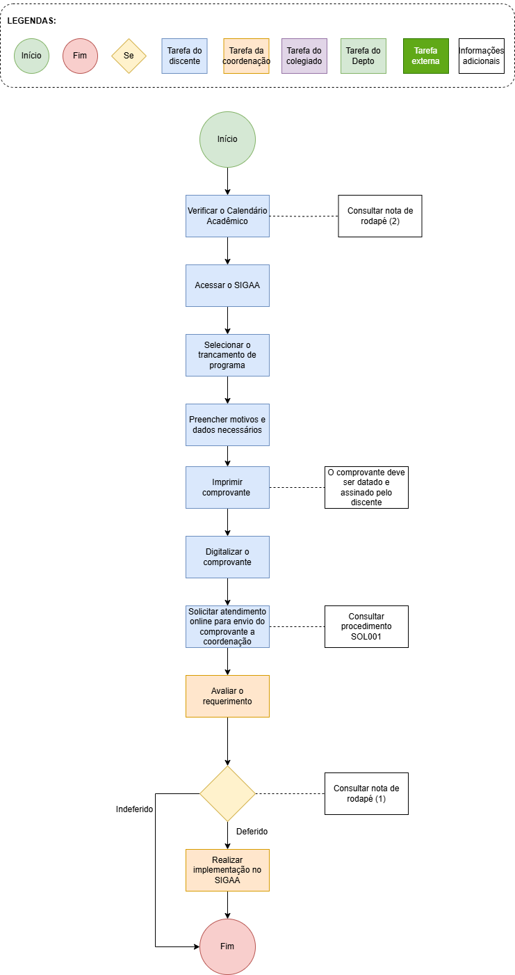 1. O discente deve acessar o Calendário acadêmico e verificar se está no período de trancamento. Consultar nota de rodapé (1) e (2).
