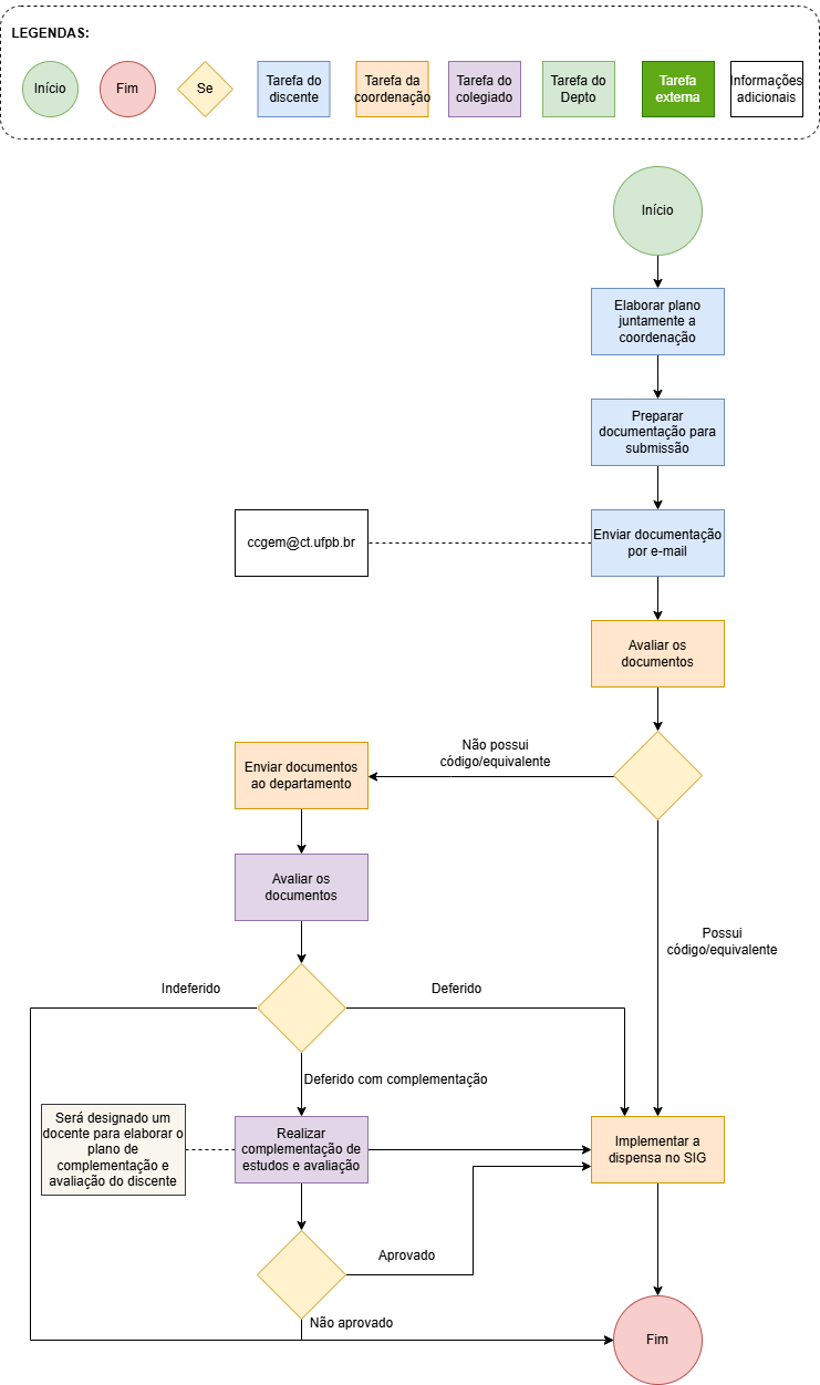 1. O discente deve por meio de um requerimento assinado juntamente aos documentos necessários, solicitar a abertura do processo de dispensa de componentes curriculares utilizando o e-mail da coordenação: ccgem@ct.ufpb.br.