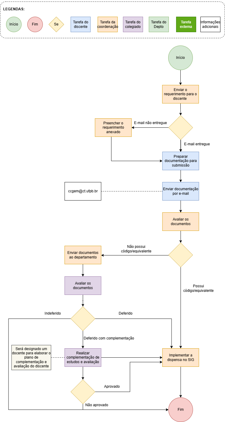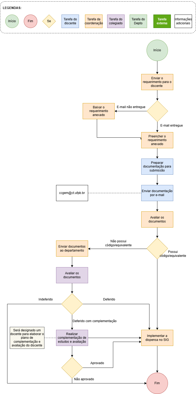 1. O discente deve por meio de um requerimento assinado juntamente aos documentos necessários, solicitar a abertura do processo de dispensa de componentes curriculares utilizando o e-mail da coordenação: ccgem@ct.ufpb.br.